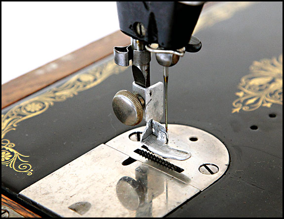 All I can really tell you about it is that it’s one of the two presser feet we found lurking in the base of that machine when we bought it in last month, they’re both hand cut and folded from aluminium sheet, and I have not the faintest idea what they’re in aid of, as folks used to say.