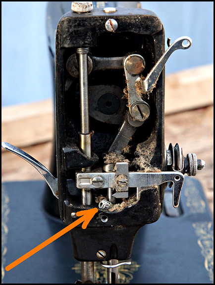I think they’re called poppers or snap fasteners in other parts of the world, but whatever they’re called, I doubt they’re often found inside sewing machines. The arrow’s pointing at half of this one, by the way. The other half was deeper inside, behind the needle bar.