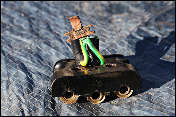 So, somebody has first of all laboriously made that little widget from steel strip. They’ve then opened up the cable entry hole in the Bakelite plug body so it will take two three-core cables instead of the usual two twin-core ones. Having stripped all six wires at the right length for four of them to connect to the three contacts inside the plug body, they’ve then pushed the two earth wires back outside and soldered them to the widget.