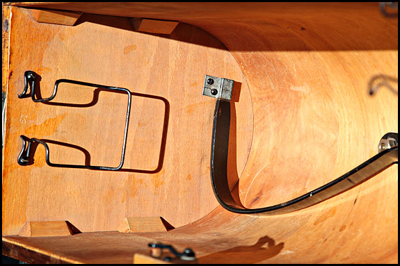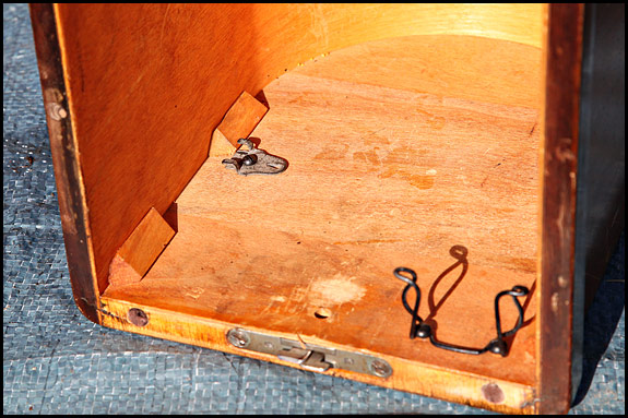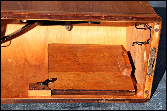 This one’s a very nice and very late (1954) Singer 128K and it comes in an equally nice bentwood (“domed”) case, complete with what we think are its original attachments. But there is, alas, a downside. Some muppet has vandalised it a bit whilst taking the lid off without a key, as you can see in the above picture. Now … I’ve replaced the lock and found a key for it and I could touch up that paintwork on the end of the bed, but although the repair to the woodwork’s a DIY job, frankly it needs better eyesight than I have. And as Elsie says, there’s also the fact that some folk won’t be bothered about the damage, so all things considered, we’re selling it “as is”.