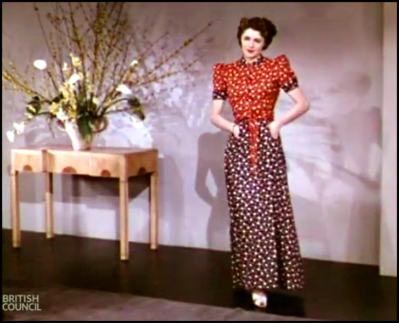 OK, it might be a bit late now to be making yourself a retro frock to wear to Sunday’s street party, but if you fancy knocking one up later, there’s plenty of inspiration to be had in the fashion show with which this fascinating film finishes. Somewhat surprisingly for 1941, the whole thing’s in Glorious Technicolor, so not only do we see proof that people in wartime Britain didn’t really live in a black and white world, but also for once we get to see what colour those fabrics were. Well, more or less.