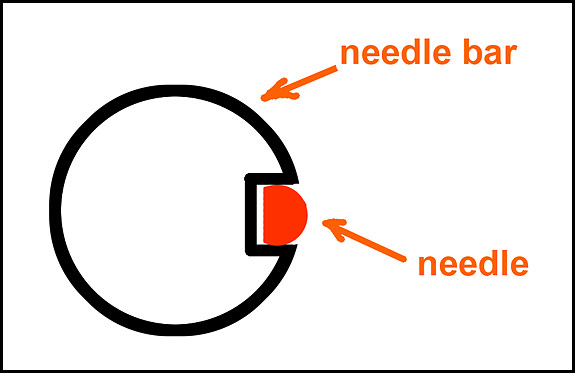The nature of the stitch it makes is determined by a cam, the red knob of which can be seen in the picture above. The attachment was sold with a set of four of those red top cams, which make an ordinary zigzag stitch and what Singer called a blind stitch, a domino stitch and an arrowhead stitch.