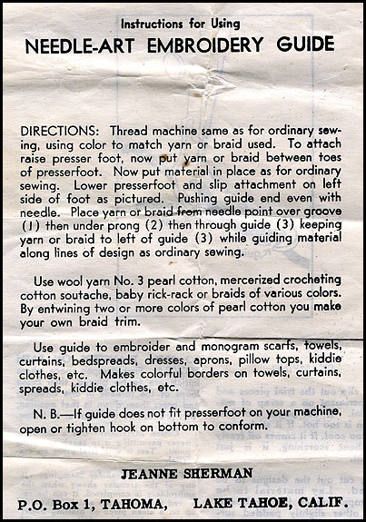 Now, given that we’d never heard of the Needle-Art Embroidery Guide before and Google still hasn’t, can anybody date its introduction for us? And who is or was Jeanne Sherman of PO Box 1, Tahoma CA? Did she make anything else? Enquiring minds need to know …