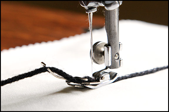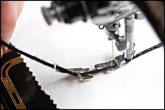 And lo – the thing works! It really does. Stays in place on the standard presser foot no problem, and you get a lovely line of stitching straight down the middle of your braid or whatever. In the picture below, Elsie’s slid it off the presser foot while still threaded so you get a better idea of how ingenious it is ..