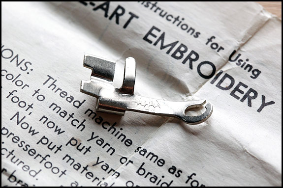 The only other thing I can tell you about the Needle-Art Embroidery Guide is that stamped on it is 93742 USA. And for what it’s worth, here’s a glimpse of it in action with the black wool on Elsie’s treadle 201K earlier on this cold, dull and wet English summer’s morn …