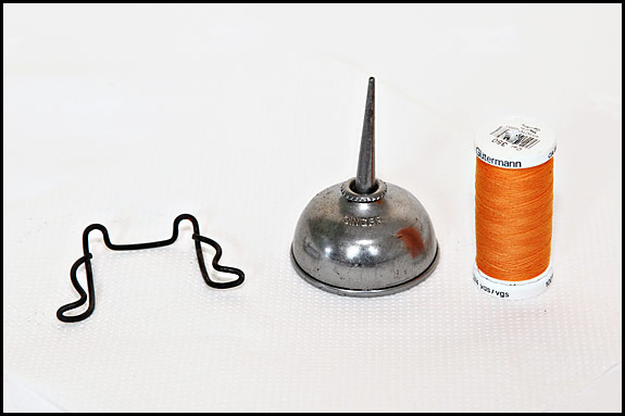 That’s the smaller of the two sizes of the green Singer sewing machine oil tin, with both sizes of Singer oiler and a standard reel of Gütermann for size comparison. Whatever the size of tin or oiler, it was held in place inside the case or cabinet by one of three types of clip. There was one made of flat spring steel strips which held the green oil tins, and there was a strange-looking black device made from folded sheet steel which held the round oilers. Unfortunately I couldn’t find examples of either type to photograph without moving and opening more machine cases than I could face doing this morning, but here’s the third and most common type of oil can clip …