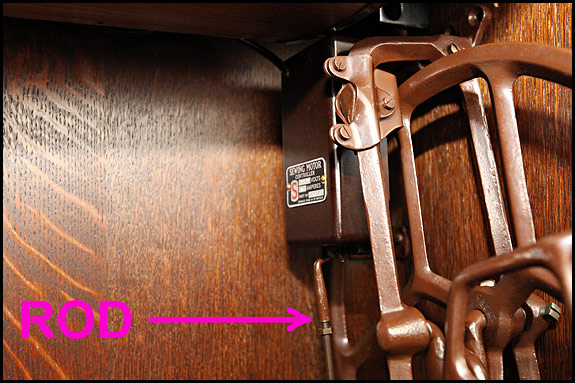 However, as you can see, the top of this particular pitman rod is not connected to the treadle wheel. It’s connected instead to that brown metal box, which is seen more clearly in this snap …