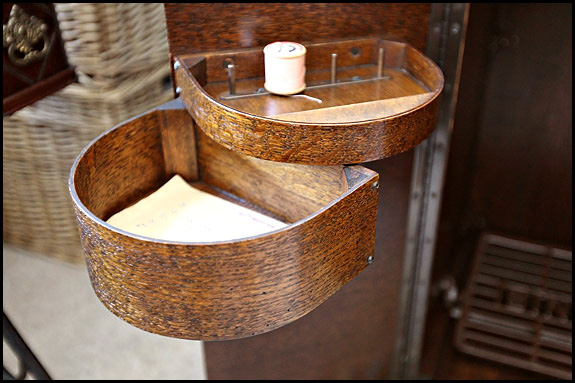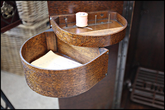 Before we get to the nitty-gritty about this cabinet, I must apologise for these less than wonderful snaps of it and get the excuses out the way. The Sewing Room measures 7ft x 9ft, it has a small window in the narrow end opposite the door, and right now there is this cabinet plus two treadle machines in it. There’s also baskets of fabric, a large bean bag (I have no idea why), Stoner’s bean bag (awaiting repair) and six other sewing machines in their cases. So there is not a lot of room. Hence these very wide angle shots …