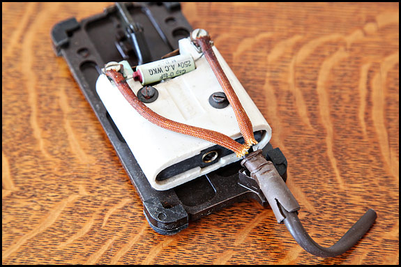 Having said that, old Singer button controllers of this type are pretty much straightforward. The basic principle is that pushing down on the button pivots a lever which pulls on a screw, which is connected to a primitive but effective variable carbon resistance. That’s so arranged that as the screw is pulled, the resistance decreases, effectively reaching zero just before the button is hard down, thereby allowing all the current through to the motor so it can go full steam ahead.