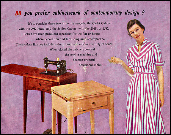 “Do you prefer cabinetwork of contemporary design?” indeed! As far as we’re concerned, the best thing about these Cabinets, which we always thought were Tables, is the fact that the legs are readily detachable. That’s a real boon when the machine you just brought home is in one of these things and you can’t quite bring yourself to take the table down to the dump recycling centre once you’ve taken the head out of it, so the only place left for it is in the attic alongside the other two.