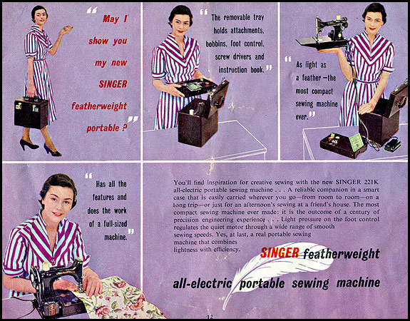 I just love the suggestion that a 221 is “easily carried wherever you go – from room to room – on a long trip – or just for an afternoon’s sewing at a friend’s house.” An afternoon’s sewing at a friend’s house? Who is the woman kidding? Or is that code for “so easy to cart about with you to show off to your friends and make them really jealous”? Whatever, Featherweights are undoubtedly cute and they certainly have a huge following with quilters in the States, but for our money they’re over-rated. There. I said it.