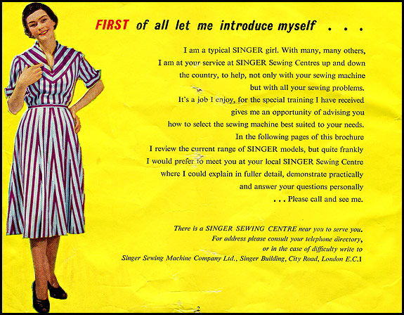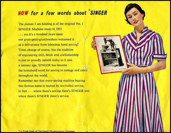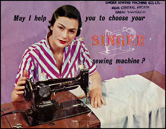 Oh dear, that mirror over the fireplace is way off-centre! But who cares when by simply fitting a Singer Motor to the machine, one can do “more and better work without fatigue”? And the friendly chap from the local Singer shop will be delighted to pop round and demonstrate at your convenience too. I’m sure he won’t say anything about the mirror.