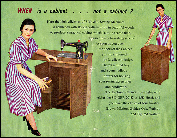 Apparently “Singer Machines on this type of cabinet work form a prominent feature in thousands of homes”. So I wonder why they’re decidedly uncommon in England now. Neither of us is certain that we’ve ever seen one!